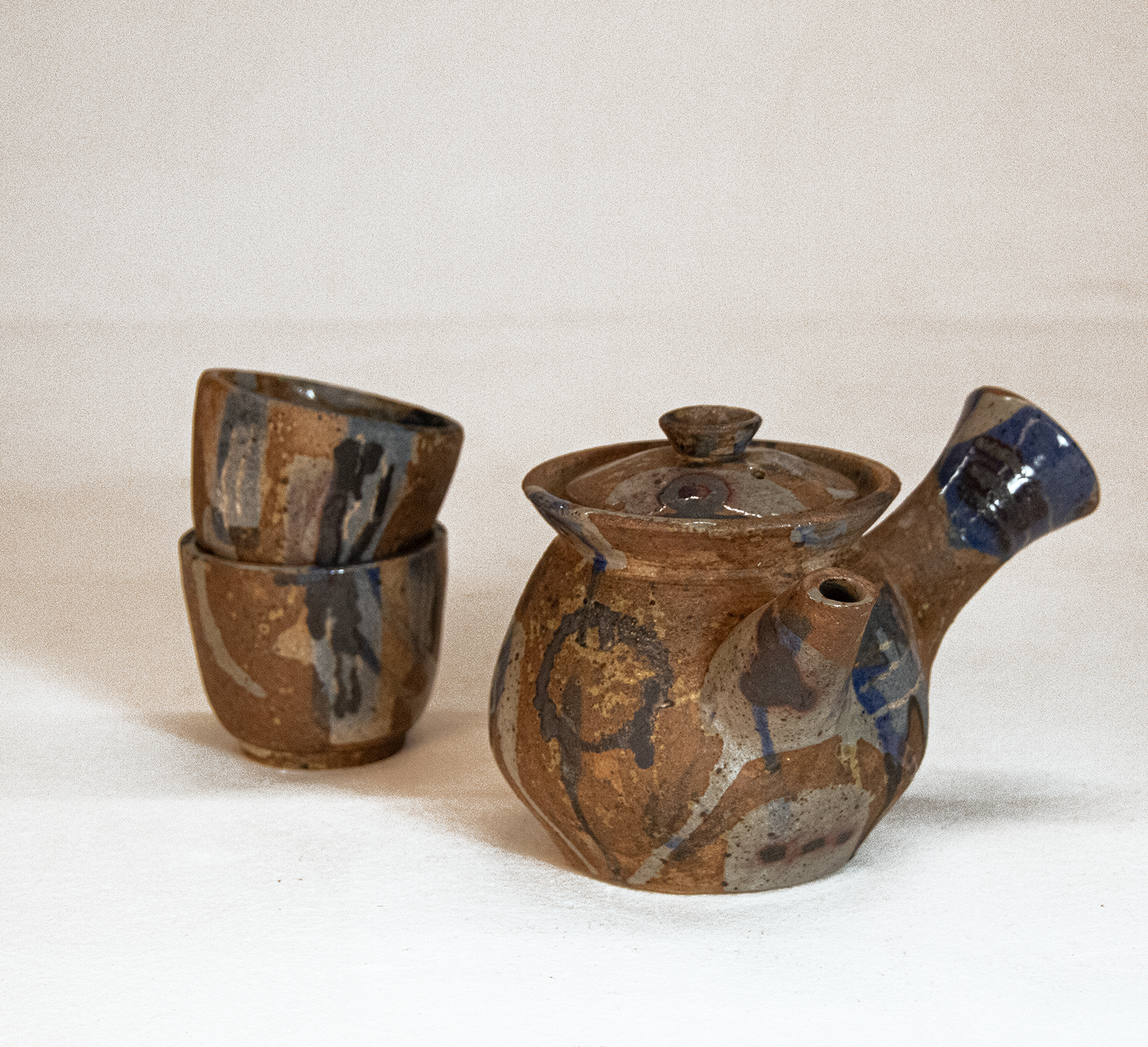 I created this generation of work while working as a studio assistant at my former university. While mixing wood ash glazes for the studio, I became curious about wood ash and what it could do for my work. Bored with the dull clay body that haunted the electric and gas kilns, I began incorporating wood ash into my work to liven up and bring warmth to the surface of the clay. In addition to the wood ash distinguishing this body of work, my use of copper oxide in my surface decoration is a new development in my work.